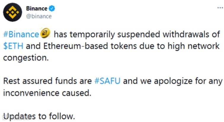 值得注意的是,头部数字货币交易所币安(Binance)发布通知称,由于高网络拥塞,暂停了以太坊和基于以太坊的代币的提现。