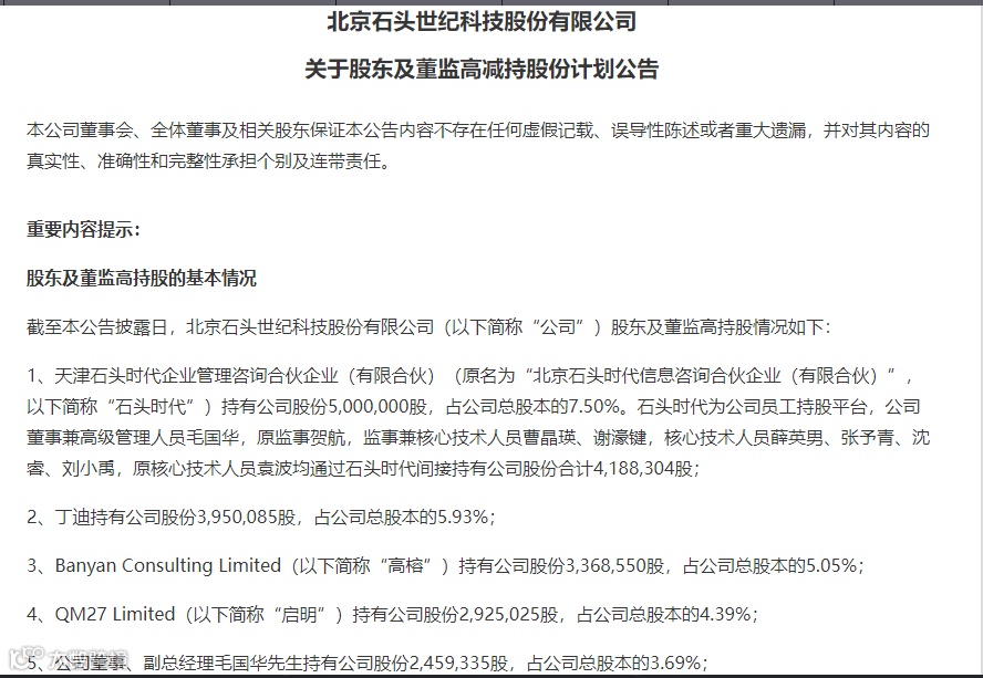 减持股东名单包括石头时代(即“天津石头时代企业管理咨询合伙企业(有限合伙)”)、丁迪、高榕(即“Banyan Consulting Limited”)、启明(即“QM27 Limited”)、顺为(即“Shunwei Ventures III(Hong Kong)Limited”)、天津金米(即“天津金米投资合伙企业(有限合伙)”)、公司董监高毛国华、吴震、万云鹏、张志淳等10名股东。顺为和天津金米都是雷军的“小米系”。本次拟减持合计不超过183.33万股,对应市值17.71亿元。