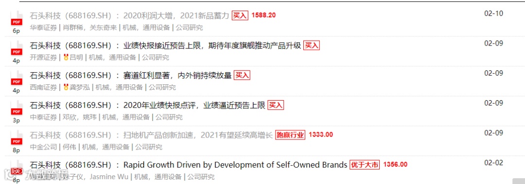 中金公司2月9日发布研报《石头科技(688169):扫地机产品创新加速 2021有望延续高增长》称,公司发布2020年业绩快报,收入45.3亿元,同比增长7.7%;归母净利润13.7亿元,同比增长75.2%,净利润率30.3%。对应4Q20收入15.5亿元,同比增长31.9%,归母净利润4.72 亿元,同比增长135%,净利润率30.5%。中金公司将其目标价定到了1333元。