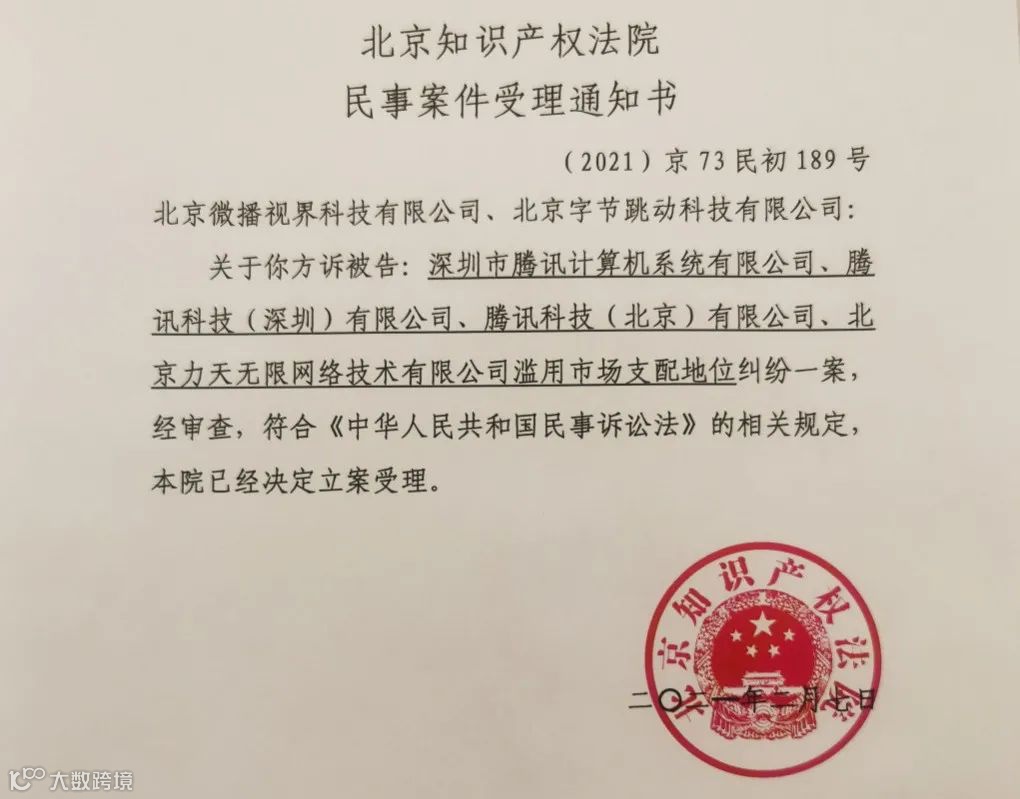 2月7日,券商中国记者从抖音获悉,北京知识产权法院正式立案受理了抖音、字节跳动的诉讼申请,被告为深圳市腾讯计算机系统有限公司、腾讯科技(北京)有限公司和北京力天无限网络技术有限公司,起诉的理由是:腾讯及相关公司“滥用市场支配地位”。