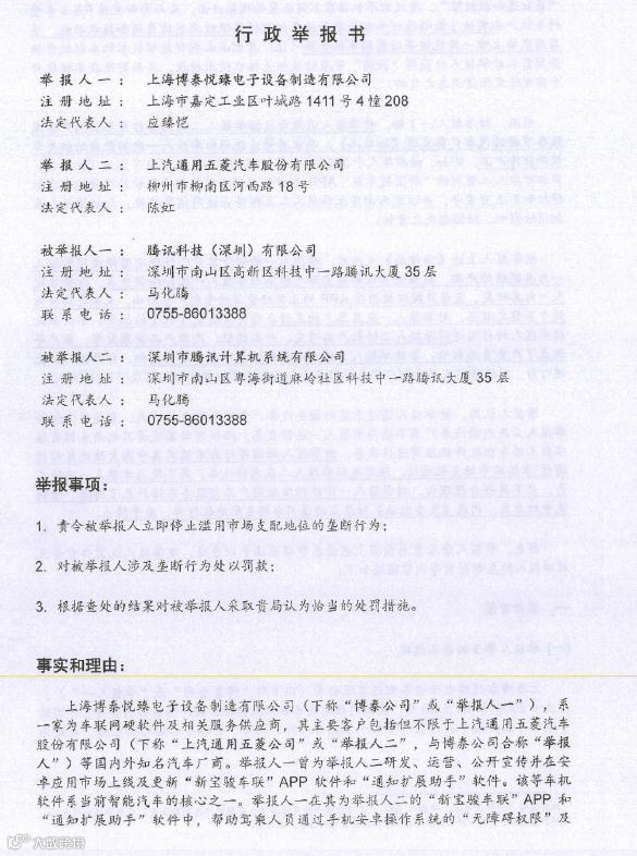 2月9日,据中新经纬报道,上海博泰和上汽通用五菱就腾讯涉嫌垄断一事于近日共同向国家市场监管总局反垄断局提交了反垄断举报书。