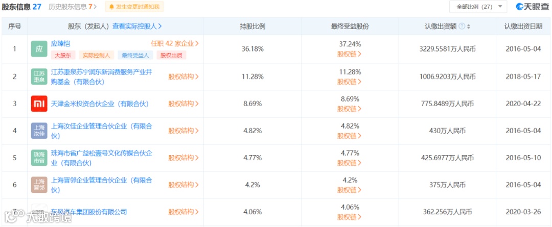 上海博泰的大股东系应臻恺,持股比例为36.18%,小米系的金米投资、东风汽车集团分别持股8.69%、4.06%。