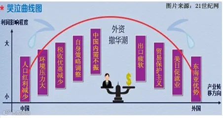 哭泣曲线由21世纪网周斌提出,描述中国制造业当前面临的困境。外资撤离中国的背后,实则是中国外贸转型升级的大课题——劳动力价格优势不复存在的时候,传统的代工模式也已经难以为继。