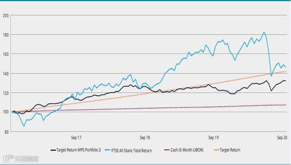 下图是美国MPS的投资表现,我们可以看到黑色的收益曲线,稳定围绕目标回报(橙色曲线)并且严格控制在FTSE ALL SHARE 指数收益曲线和现金收益曲线之间。