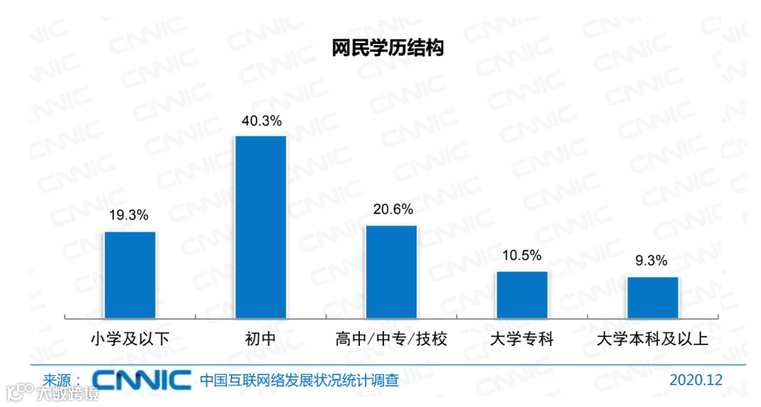 学历方面,初中、高中/中专/技校学历的网民群体占比分别为40.3%、20.6%,小学及以下网民群体占比为19.3%,本科及以上的网民占比为9.3%。