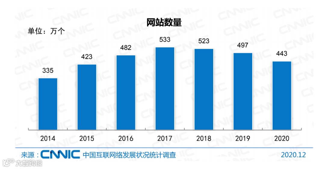 截至去年底,我国域名注册者在中国境内的网站数量为443万个。近三年来,网站数量已持续下降,也体现出互联网整体移动化的趋势。