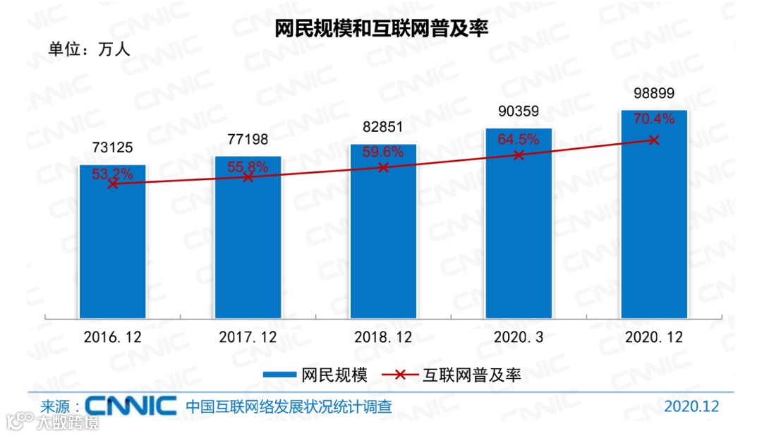 《报告》显示,截至2020年12月,我国网民规模达9.89亿,较2020年3月增长8540万,互联网普及率达70.4%。