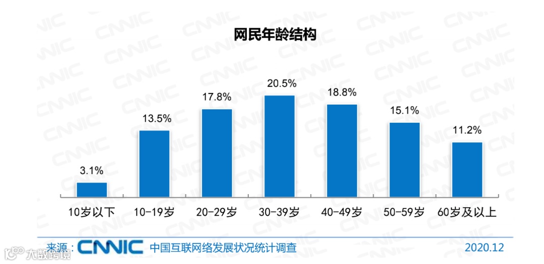 性别结构上,我国网民男女比例为51:49,与整体人口中男女比例基本一致。年龄结构上,20-29岁、30-39岁、40-49岁网民占比分别为17.8%、20.5%和18.8%,高于其他年龄段。50岁及以上网民群体占比由2020年3月的16.9%提升至26.3%,说明互联网进一步向中老年群体渗透。
