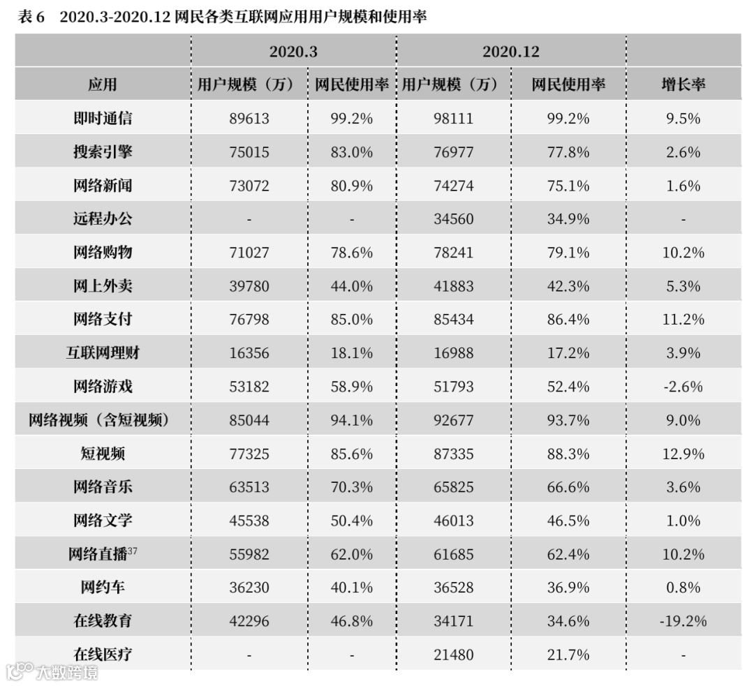 2020年,短视频、网络支付、网络购物的用户规模增长最为显著,增长率分别为12.9%、11.2%和10.2%。