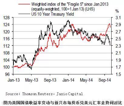然而,印尼盾、印度卢比以及新兴市场货币整体未受重创,可能也与当前美国国债市场相对稳定有关。美元兑“脆弱五国”货币(印度卢比、印尼盾、巴西雷亚尔、南非兰特和土耳其里拉)指数与10年期美国国债收益率之间所形成的关系可能不尽完美,但有一点很明显,即新兴市场货币将关注美国国债市场走势。十国集团(G10)货币似乎更关注收益率曲线短端的差值,而新兴市场货币似乎更关注10年期国债的收益率。我们预计明年10年期美国国债收益率不会上升,这应该会限制对新兴市场货币的影响。但如果美国国债收益率飙升,将大幅增加新兴市场货币的脆弱性,强势美元也将随之飙升。当然,强势美元的副作用之一是拉低输入性通胀。这反过来可能有助于舒缓美国国债收益率曲线长端的任何上行压力,从而降低新兴市场货币像2013年那样遭受重创的风险。
