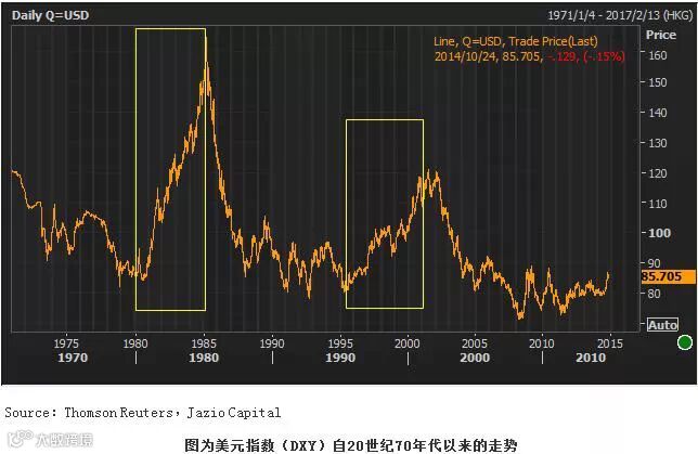 美元是其它国家的反通缩策略能否成功的核心,但也因此最有可能危及这些策略的成功与否。哪里是尽头?在本文中,我们将仅就这一问题展开分析,同时将在下一期分析报告中给予我们对于其它主要经济体货币以及贵金属潜在趋势的阐述。