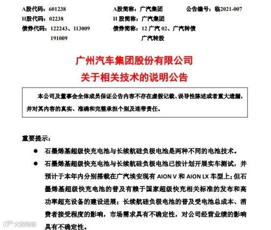 市场需求具有不确定性广汽集团1月18日晚间公告称,石墨烯基超级快充电池与长续航硅负极电池是两种不同的技术,分别解决“充电速度慢”、“续航里程短”这两个动力电池应用中的不同痛点。