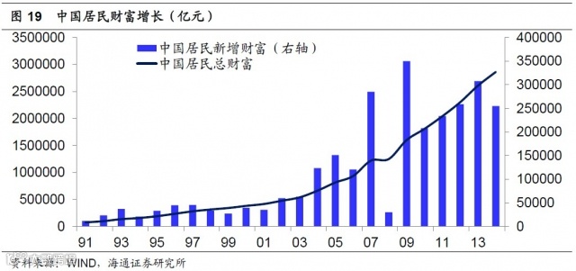 而从中国居民财富增长角度观察,过去10 年财富稳步增加,每年新增财富都在20-30万亿之间,目前居民总财富已经接近300 万亿。