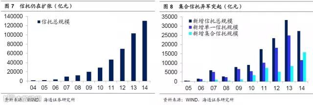 信托在过去几年异军突起,成为金融行业管理资产规模仅次于银行的机构。而与大众印象不同的是,14 年的信托规模扩张虽有放缓,但并未停滞。当年新增信托规模也接近3万亿。虽然从存量看单一信托代表的通道业务仍是主体,但从增量看14 年集合信托规模已经很超过了单一信托,反映了自主管理资产规模的增加。