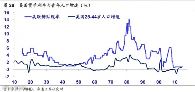 美联储成立于1914年,观察美联储官方基准利率走势,我们发现过去的100年可以大致分为3个周期,每隔30年左右变动一次方向。而这一官方利率走势与美国25-44岁青年人口增速的走势高度一致。这意味着从长期来看人口结构变化是影响利率走势的最关键因素,随着人口红利拐点的出现,零利率是长期趋势,和央行的政策取向无关。