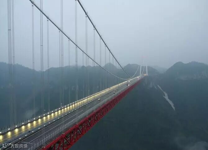 矮寨特大悬索桥,位于湖南湘西矮寨镇境内。矮寨悬索桥,距吉首市区约20公里,跨越矮寨镇附近的山谷,德夯河流经谷底,桥面设计标高与地面高差达330米左右,全长1073.65m,悬索桥的主跨为1176m。该桥跨越矮寨大峡谷,主跨居世界第三、亚洲第一。
