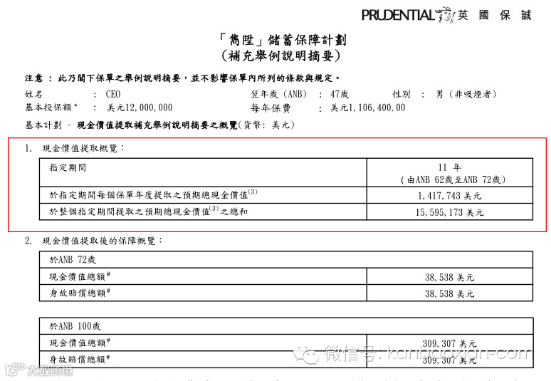 二.待到马先生66岁之时,隽升保单已经增值至14,840,429,相较5,532,000美元总保费,资产已经增值268%。