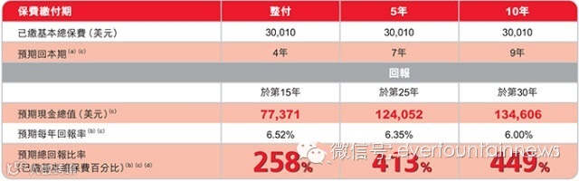 马先生的隽升保单仅需缴费五年,每年保费1,106,400美元,五年共计缴费5,532,000美元,此后无需再缴费,收益和保障则伴随马先生终身。