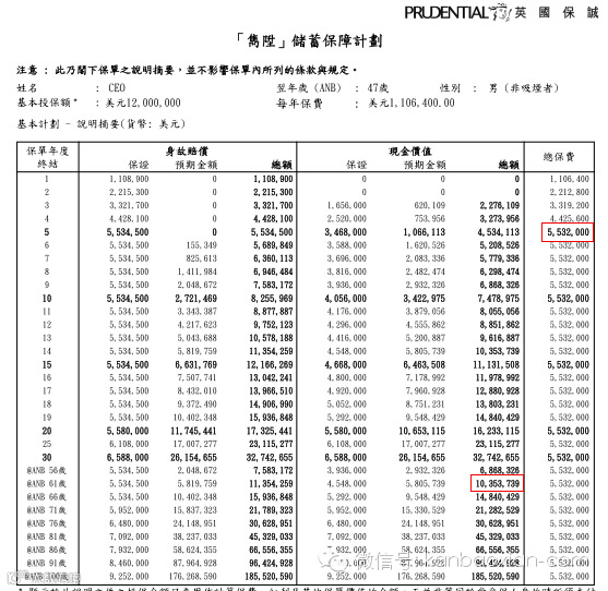 一.马先生于47岁投保,总保费为5,532,000美元,待到马先生61岁之时,隽升保单已经增值至10,353,739美元。