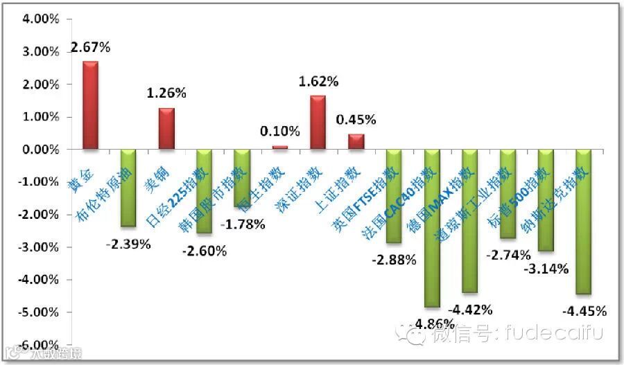 上周市场走势:欧美日韩股市大跌, A股上涨,黄金、铜大涨,石油大跌。