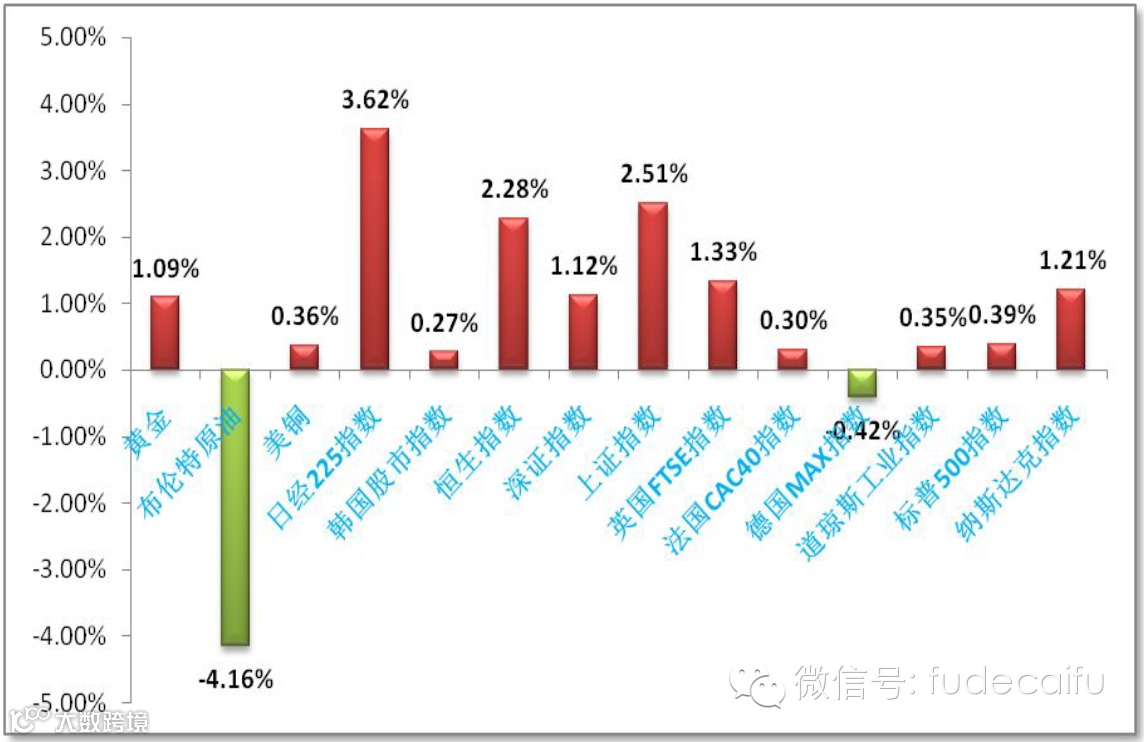 上周市场走势:全球股市普涨,美日股市延续涨势,A股港股大涨,黄金、铜微涨,石油大跌。