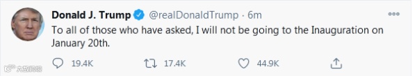 据环球网,特朗普发推特表示,“所有那些好奇(我会不会参加就职典礼)的人,我1月20日不会去参加(拜登的)就职典礼。”