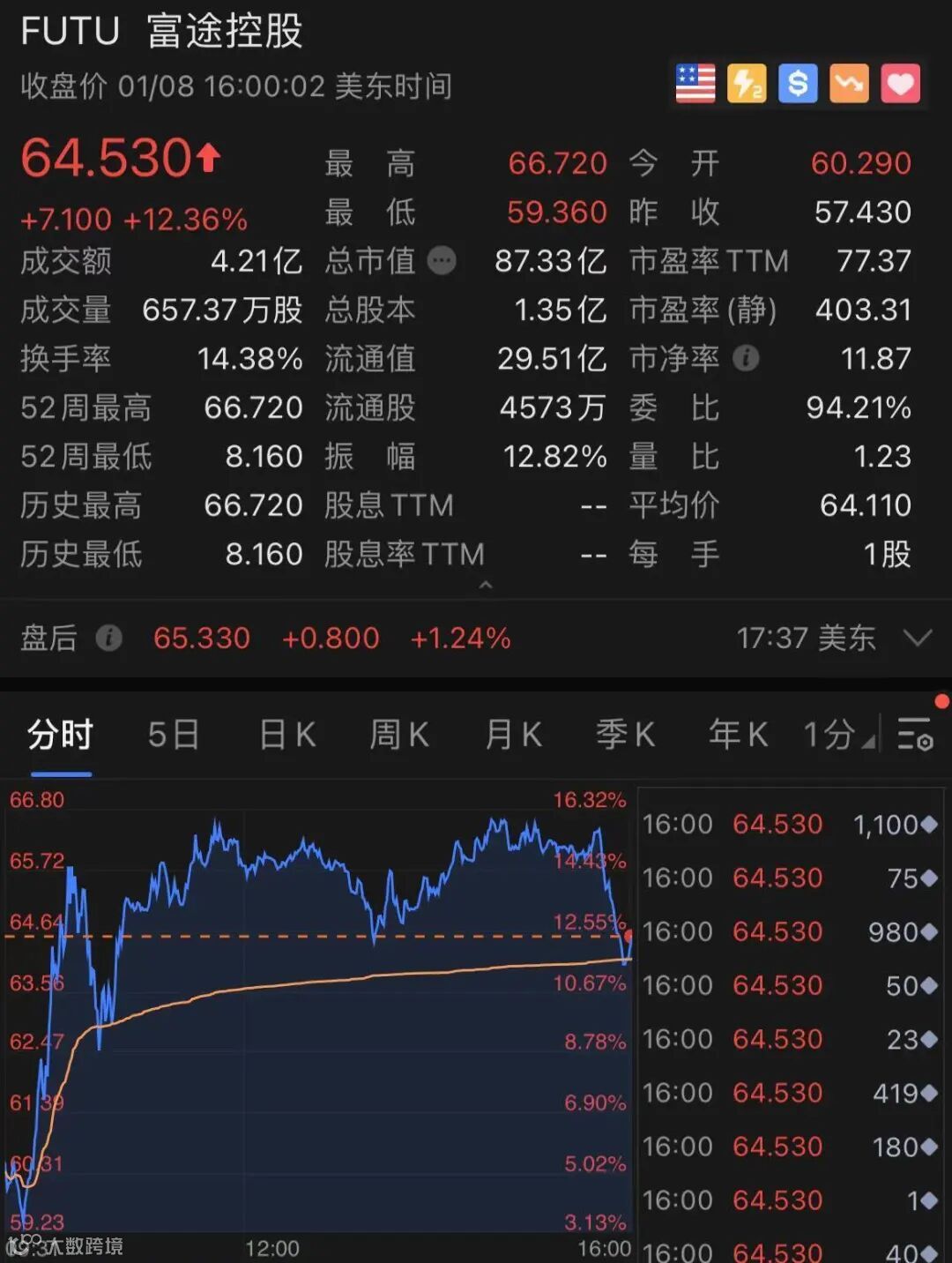 富途涨12.36%,创下历史新高。
