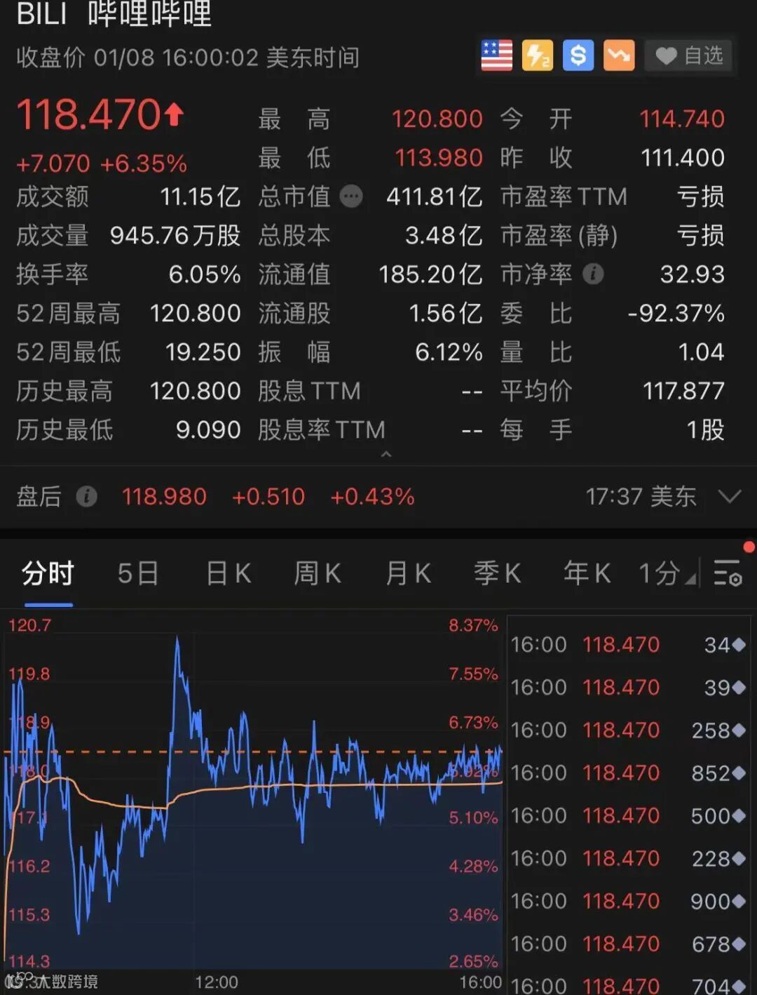 B站涨6.35%,创下历史新高。