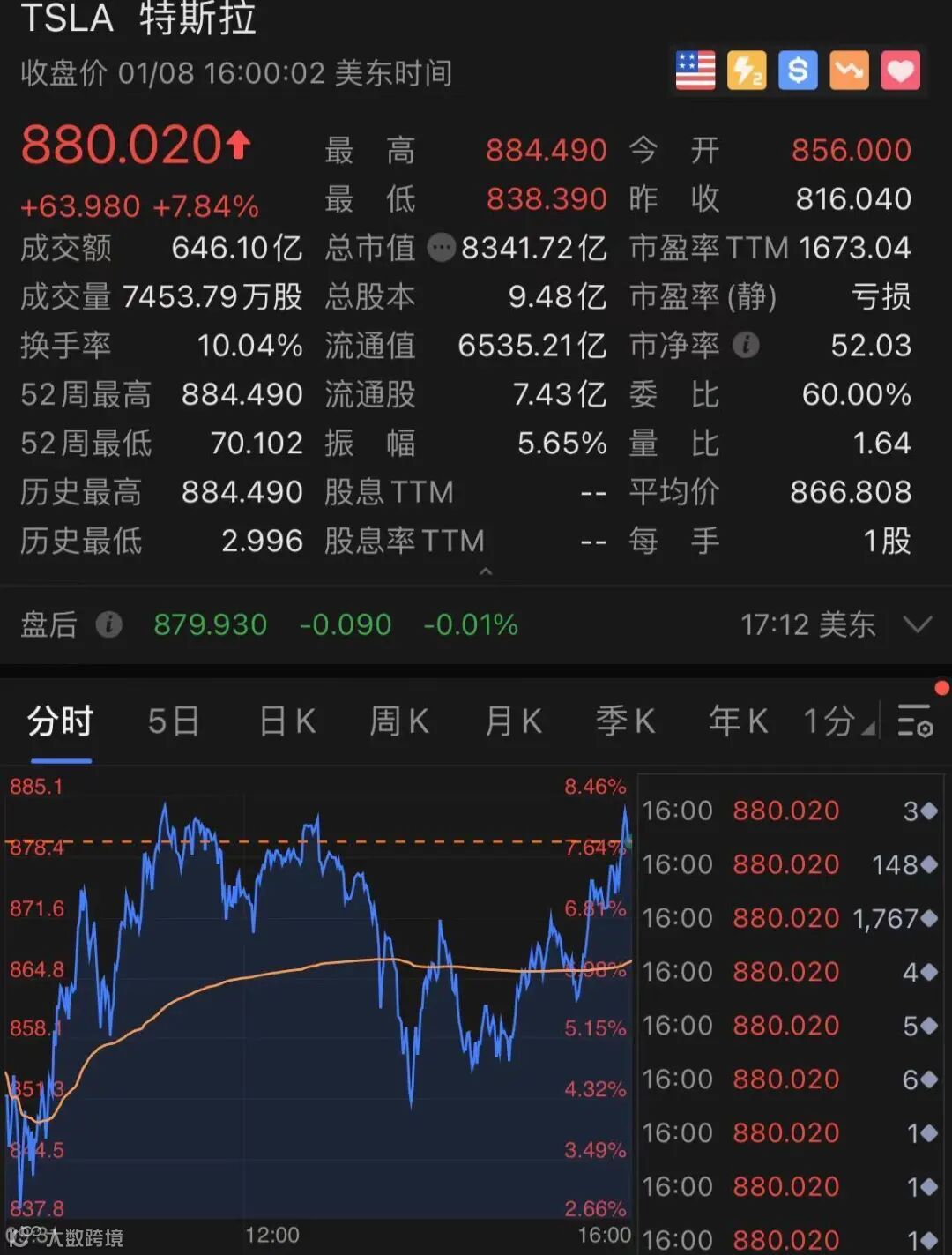 继周四大涨近8%后,特斯拉周五再次大涨7.84%,股价创新高,市值增长606亿美元,约合3920亿人民币。
