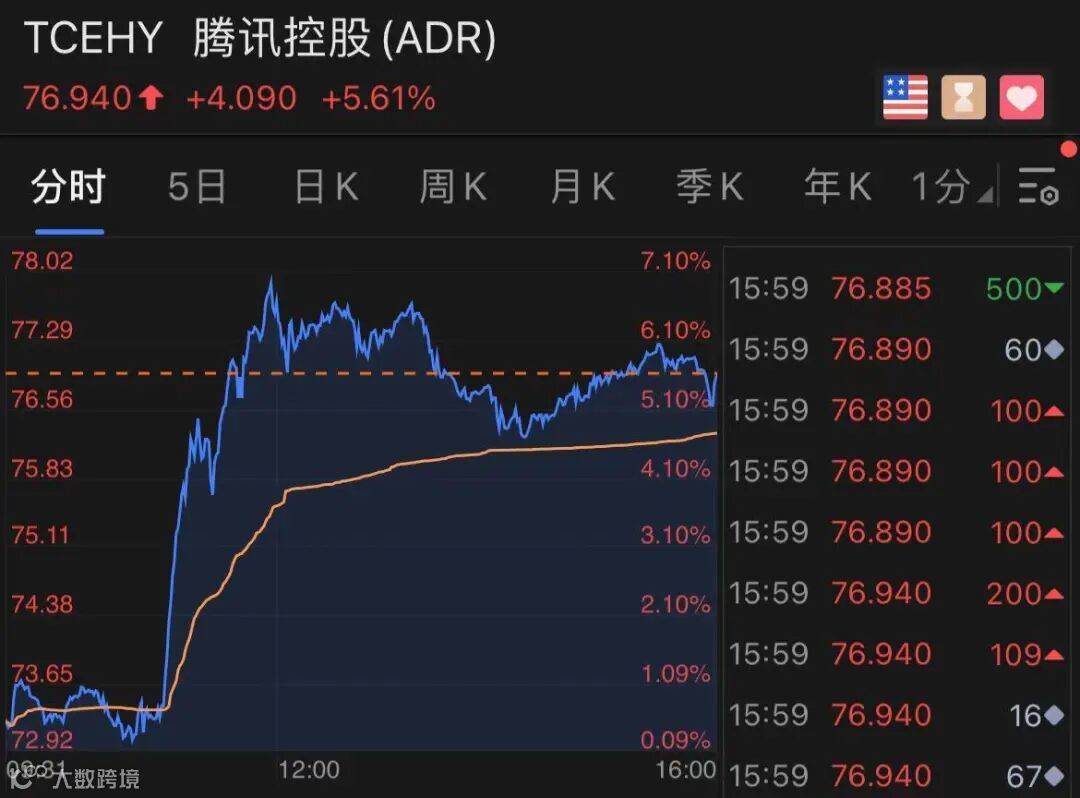 包括暴涨15%的百度在内,BATJ均涨超4%:阿里涨4.09%,腾讯ADR涨5.61%,京东涨4.12%。