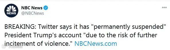 据美国全国广播公司消息,推特公司称:“由于存在进一步煽动暴力行为的风险“,已‘永久封停’特朗普推特帐号。”