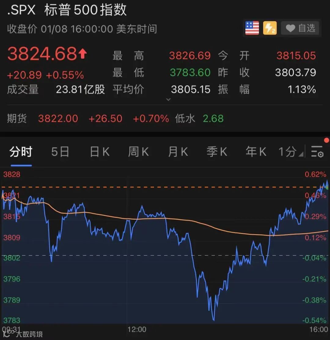 标普500指数涨20.89点,报3824.68点,涨幅为0.55%,创盘中及收盘新高。