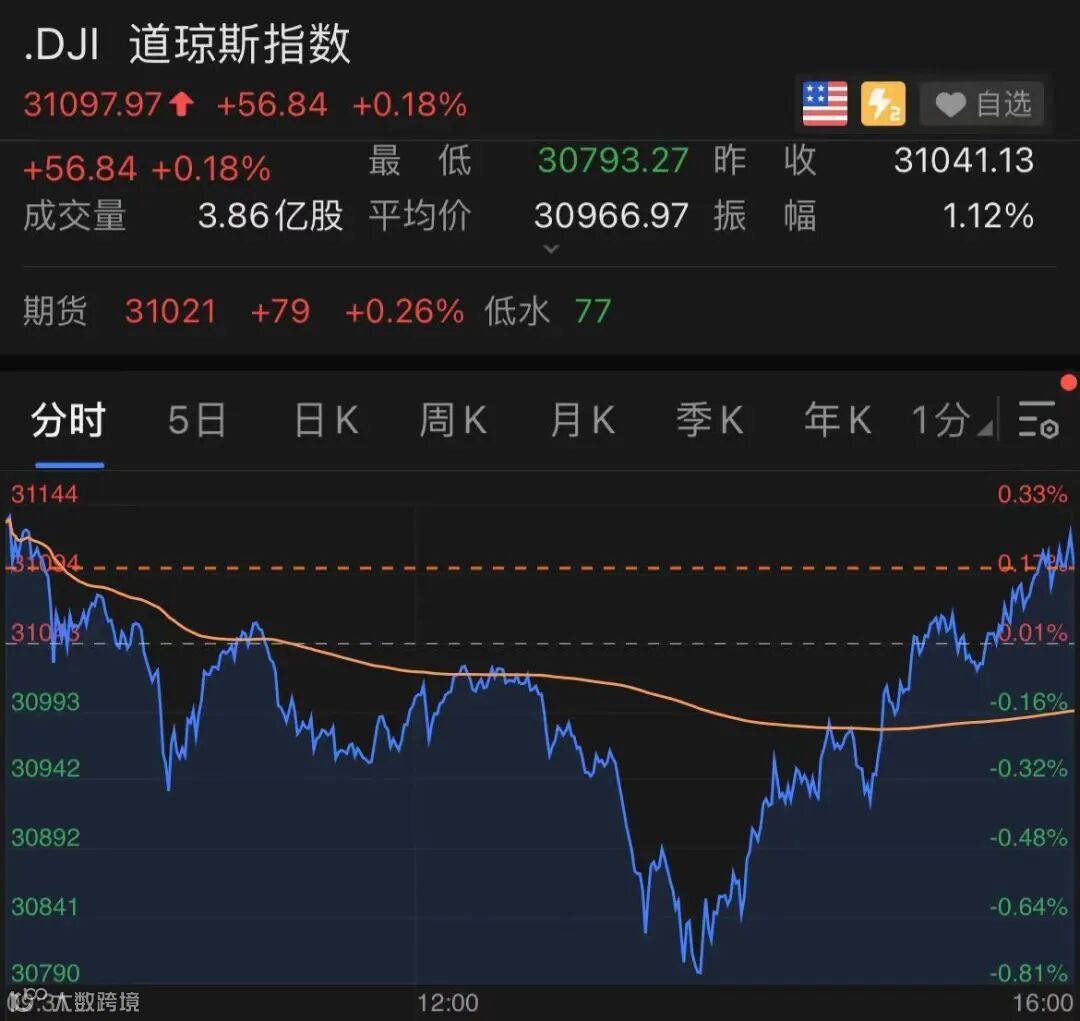 截至收盘,道指涨56.84点,报31097.97点,涨幅为0.18%,创收盘新高。