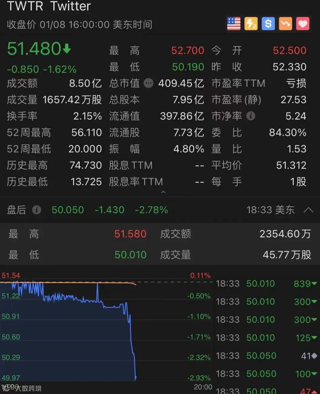 推特却跌了,宣布永久封禁特朗普账户后,盘后一度跳水近3%。