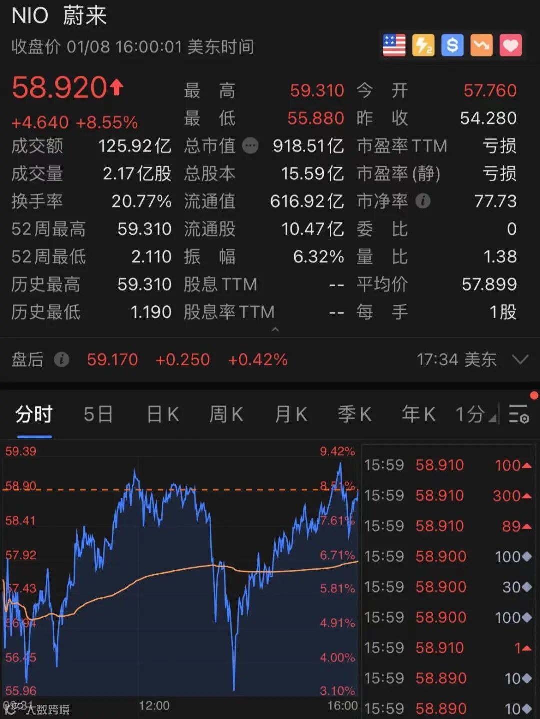 蔚来汽车也大涨8.55%,市值突破900亿美元,创历史新高。