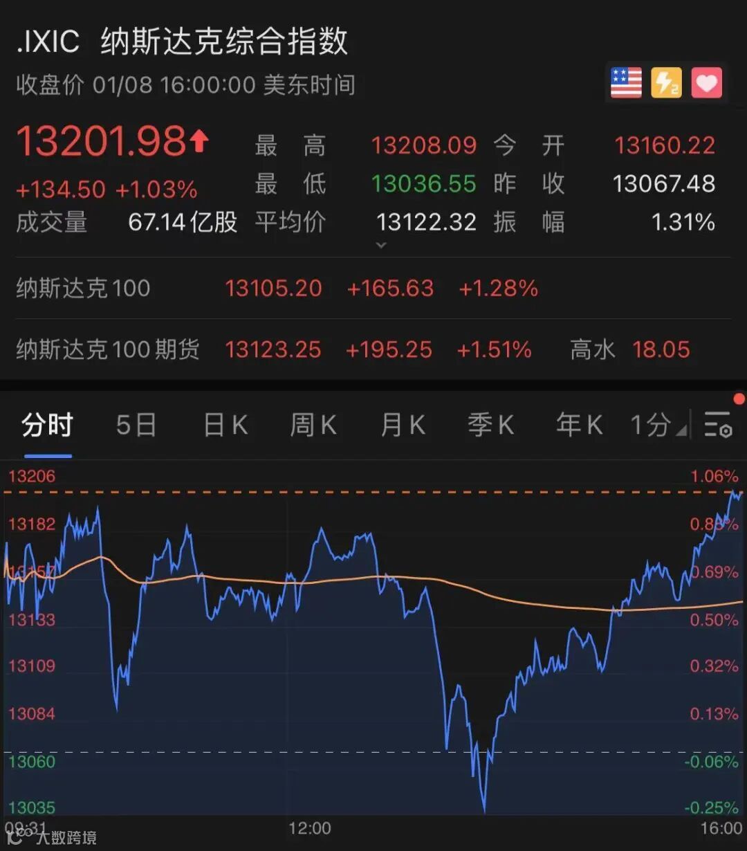 纳指涨134.5点,报13201.98点,涨幅为1.03%,创盘中及收盘新高。