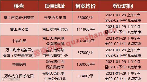 这个6个盘分别是:沙井海岸城、光明万科光年四季、南山深铁懿府、香山道公馆、中泰印邸、富士君荟苑/君悦府。