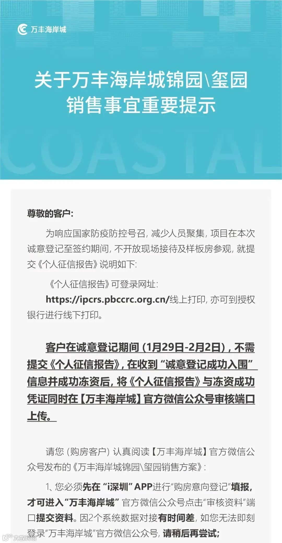 由于前往银行排队的人太多,开发商万丰海岸城锦园考虑疫情期间需尽量减少人员聚集,在30日凌晨的微信公众号发布通知,调整提交资料的要求,准业主在诚意登记期间可以不提交个人征信报告,等收到登记入围的消息并成功冻资后,再提交个人征信报告。而这个报告也可以在网上打印。