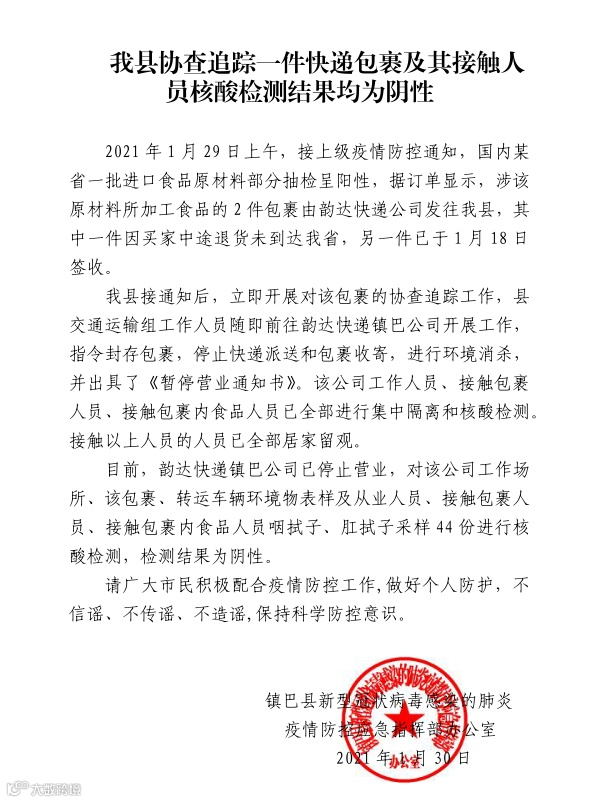 据“镇巴发布”微信30日消息,29日,接上级疫情防控通知,国内某省一批进口食品原材料部分抽检呈阳性。据订单显示,涉该原材料所加工食品的2件包裹由韵达快递发往镇巴县,其中一件因买家中途退货未到达陕西省,另一件已于1月18日签收。