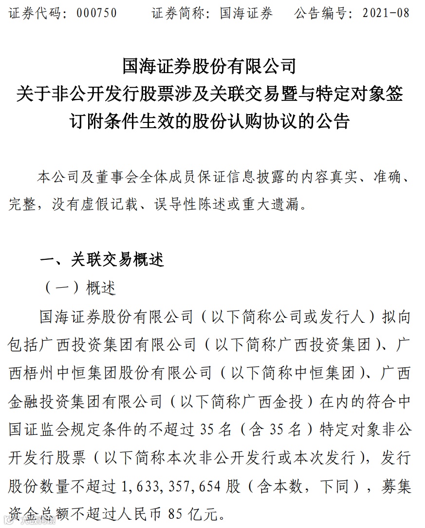 1月29日晚间,国海证券发布再融资预案,此次计划非公开发行股票数量不超过16.33亿股,募集资金不超过85亿。