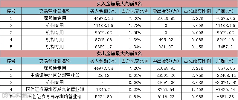 盘后龙虎榜数据显示,当日,歌尔股份被深股通卖出5.16亿元并买入4.49亿元,合计净卖出6676万元;此外,中信证券北京总部卖出2.35亿元;另有4家机构合计买入3.79亿元,一家机构卖出2.27亿元。
