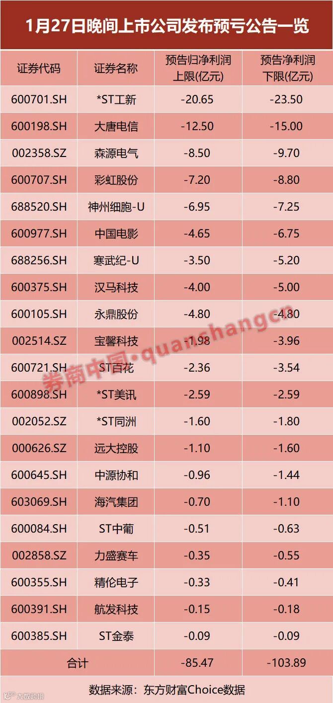 1月27日晚间,多家公司披露业绩大幅亏损的预告。