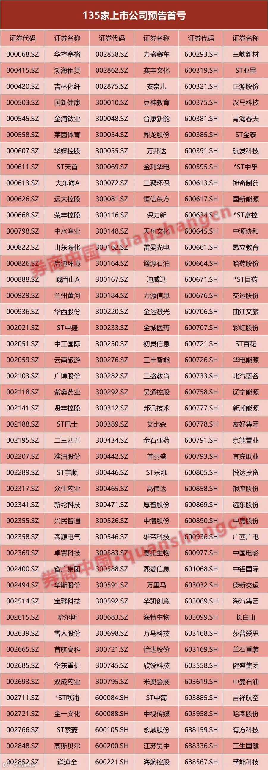 券商中国记者通过wind有统计,截至1月27日,已经披露业绩预告和业绩快报的公司中,有135家上市公司会出现首亏。其中,首亏亏损额最大的是金一文化,公司预计2020年的净利润下限为亏损34亿元。