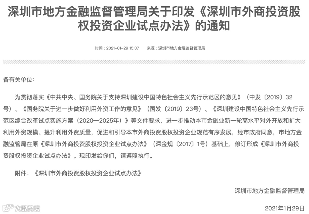1月29日,深圳金融局发布关于印发《深圳市外商投资股权投资企业试点办法》(简称“试点办法”)通知,明确QFLP(即“外商投资股权投资企业”)可参与投资境内私募股权、创业投资基金,并鼓励所投资的私募股权、创业投资基金直接投资于实体经济企业。