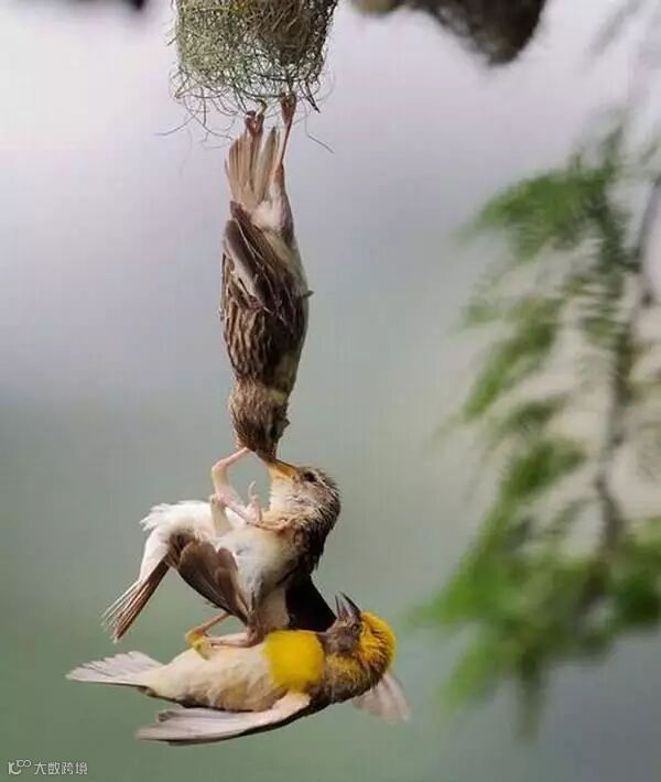 小幼鸟从鸟巢跌落,爸爸妈妈试图救它的那一瞬间。
