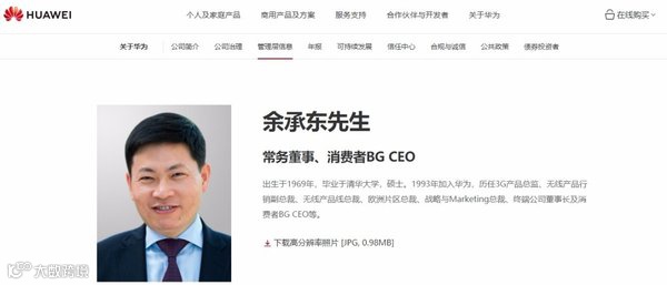 华为内部任前公示资料,余承东,1969年生,安徽省六安市霍邱县人,本科毕业于西北工业大学自动控制系,研究生毕业于清华大学,1993年加入华为,历任3G产品总监、无线产品行销副总裁、无线产品线总裁、欧洲片区总裁、战略与Marketing体系总裁、消费者业务CEO,目前还担任华为投资控股有限公司常务董事、董事会成员。