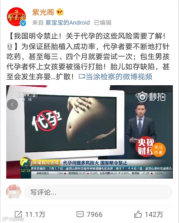 1月18日下午,紫光阁、共青团中央两家官微发布微博称,“我国明令禁止代孕,关于代孕的这些风险需要了解!”,并转发此前CCTV2关于代孕的暗访报道。