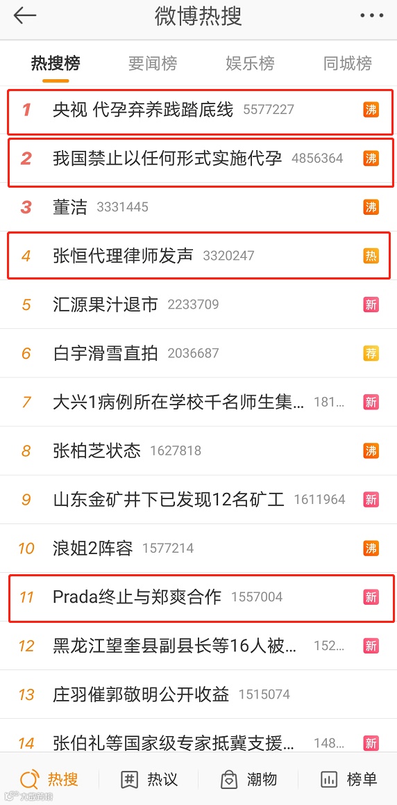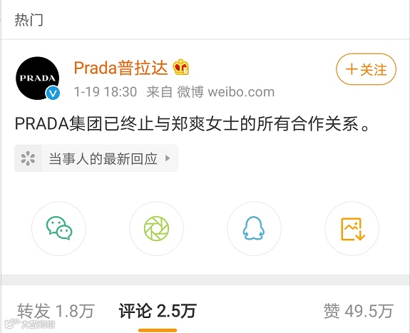 律师发声、当事人回应、品牌方公关、起底代孕产业链……连日来,微博热搜被女星郑爽“代孕弃养”及相关新闻所承包。在万众瞩目之际,1月19日晚间,因郑爽代言而“躺枪”的国际顶级品牌普拉达(Prada)祭出大招:宣布终止与郑爽的所有合作。
