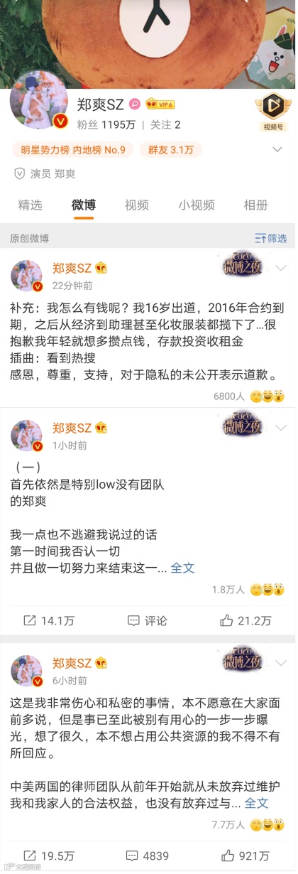 1月19日下午,郑爽开始以“爽言爽语”的模式在微博上进行连番澄清,言语冷静逻辑混乱者有之,语无伦次情绪崩溃者亦有之,具体来看: