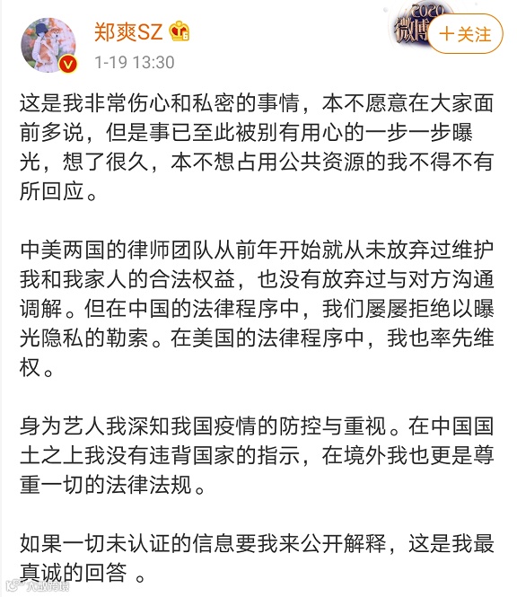 19日,郑爽回应称,这是自己非常伤心和私密的事情,本不愿意在公众面前多说,“身为艺人我深知我国疫情的防控与重视。在中国国土之上我没有违背国家的指示,在境外我也更是尊重一切的法律法规。” 中央政法委长安剑发文称,“郑爽的回应,却通篇强调自己没有违法,丝毫没有任何悔过、道歉的意思。”